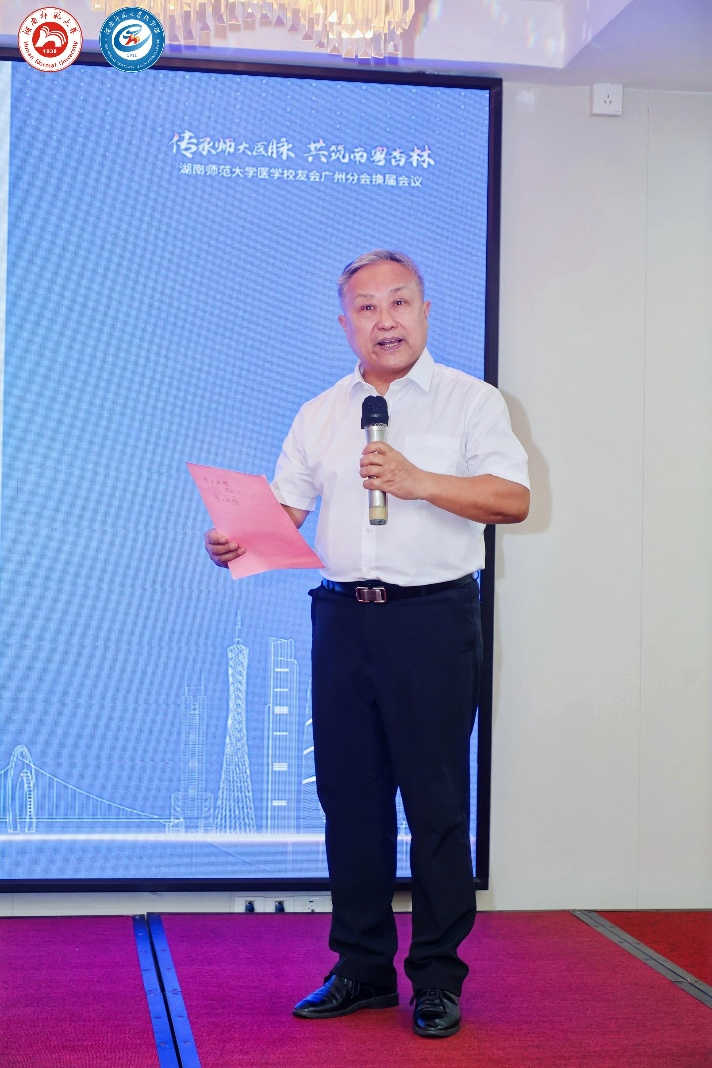 会议伊始,主持人介绍了莅临本次会议的领导和嘉宾,包括sunbet申搏医学部党工委书记、主任祝益民,sunbet申搏原副校长兼医学校友会会长瞿树林、校友总会秘书长黄丽萍、校友总会联络部主任袁鑫、医学部党工委副书记鄢朝晖、医学校友会副会长谭伟、招生与就业指导处副处长兼医学校友会秘书长陈松、就业管理科科长周紫阳、药学院副院长冯星、医学部教师肖琳琳、医学校友会副会长兼康寿制药公司总经理谈发金、广东省sunbet申搏校友会常务副会长兼秘书长贺浪萍、医学校友会珠海分会会长欧阳梦飞、深圳校友分会副会长宁挺以及广州分会名誉会长张友凯。全体与会人员以热烈的掌声向各位领导和嘉宾致以诚挚的欢迎和衷心的感谢。