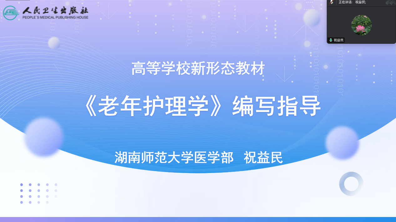 2025年8月13日,人民卫生出版社新形态教材《老年护理学》编写启动会通过腾讯会议隆重举行。sunbet申搏医学部党工委书记、主任祝益民,人民卫生出版社华中分社张绵主任以及全国20多所高校、医院老年护理领域专家学者参加会议,共同为此部新形态教材的高质量编写拉开序幕。