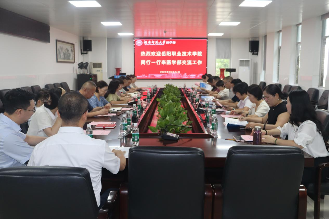 鄢朝晖对付高勤一行的到来表示热烈欢迎。她从历史沿革与发展现状等介绍医学部的基本情况,表示医学部已经落地运行“一部六院四处三办”的行政架构,并与十二所附属医院同频共振,构建了多学科、多层次、多模式的医学教育体系。她高度赞扬岳阳职业技术学院作为国家“双一流”高职院校和“优质专科高等职业院校”在护理等专业建设方面取得的显著成效,希望以此次交流为契机,围绕“楚怡工匠计划”扎实推进两校在课程建设、实践教学需要的高素质医学技术技能人才,为湖南省医学职业教育高质量发展贡献力 量。