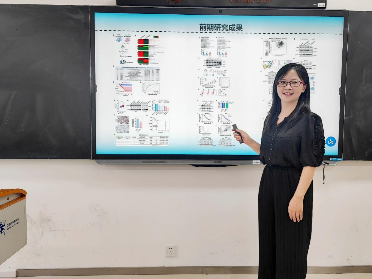 郑婵娟老师以2025年立项国家自然科学基金项目“洛伐他汀下调MRPS27介导FZD1翻译抑制三阴性乳腺癌细胞干性”为题,从研究背景、科学假说、创新点、前期成果到申报历程娓娓道来,参会师生踊跃提问互动。