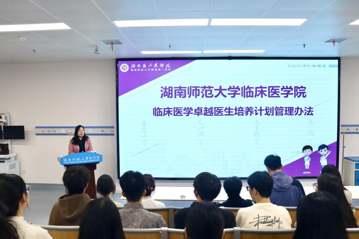 会上,洪秀琴围绕人才培养核心方案展开详细解读。她介绍,医学部针对卓医班特色培养需求,推行“双导师”制与“早临床、早科研”双早培养模式,为每位学生同步配备临床导师与科研导师,形成“临床技能锤炼+科研思维培育+职业规划指导”三位一体的培养闭环,助力学生提前接触临床实践与科研工作,筑牢职业发展根基。她同时指出,作为学校第一附属医院,湖南省人民医院拥有雄厚的师资力量、先进的科研平台与丰富的教学资源,将为计划实施提供全方位保障。此外,洪秀琴还公布了导师结对的具体流程,明确卓医班实施动态管理机制,鼓励学生积极参与、严谨治学。