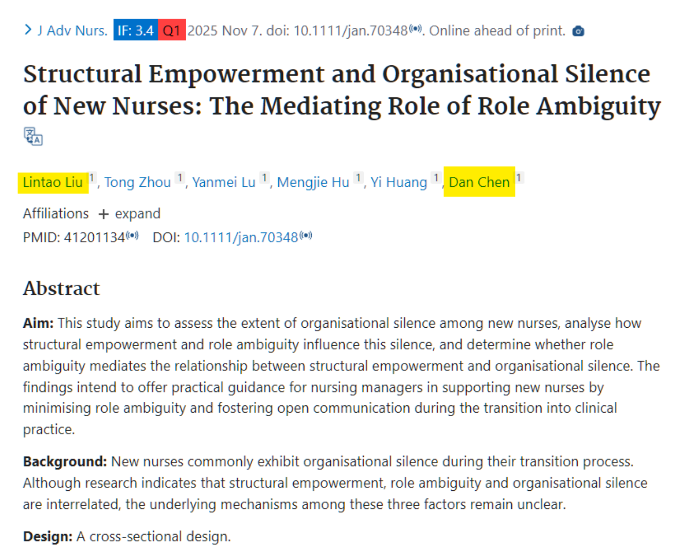 近日,sunbet申搏医学部护理学院科研工作再传捷报。由刘林涛为第一作者,陈丹教授作为通讯作者共同完成的研究论文《新护士结构性赋权与组织沉默:角色模糊的中介作用》(Structural Empowerment and Organisational Silence of New Nurses: The Mediating Role of Role Ambiguity)在国际护理学顶尖期刊《Journal of Advanced Nursing》(中科院一区)正式发表。