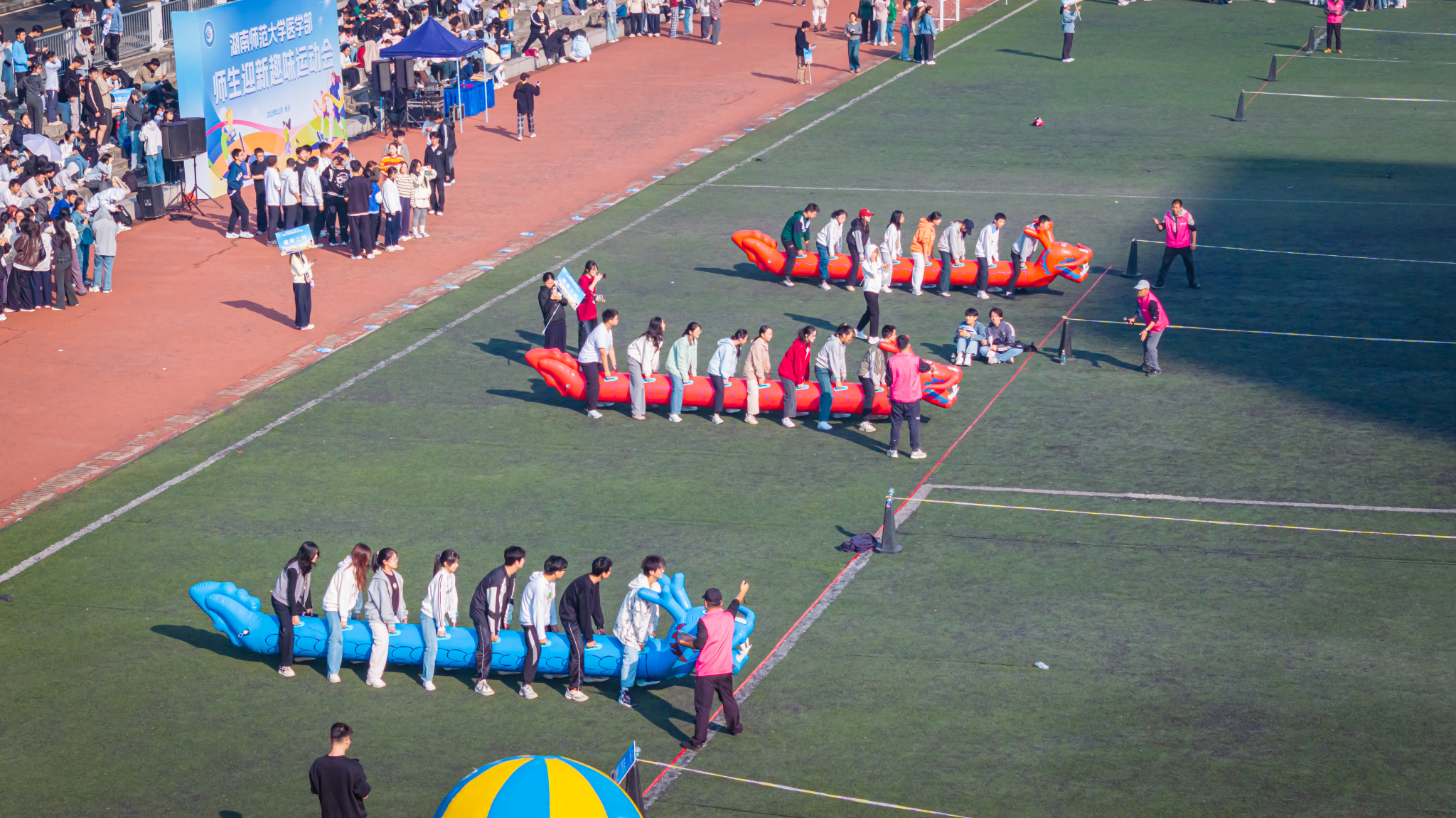 赛场上,欢声笑语与加油呐喊交织成一曲动人的青春乐章。在“运转乾坤”项目中,师生队员们一同手握把手,托举起巨型道具,以一致的步调向前冲刺。“激情方块”场地上,不仅学生们凝神投掷,老师们也跃跃欲试,一展身手,引来阵阵喝彩。 在“龙行龘龘”项目里,更有师生共同跨坐在充气“龙舟”上,喊着整齐的号子,协同前行,成为了赛场上一道亮丽的风景线。 此外,在考验稳定与配合的“趣味颠球”和充满欢笑的“趣味连体裤”接力赛中,师生们亲密无间的合作与互动,将现场气氛一次次推向高潮。