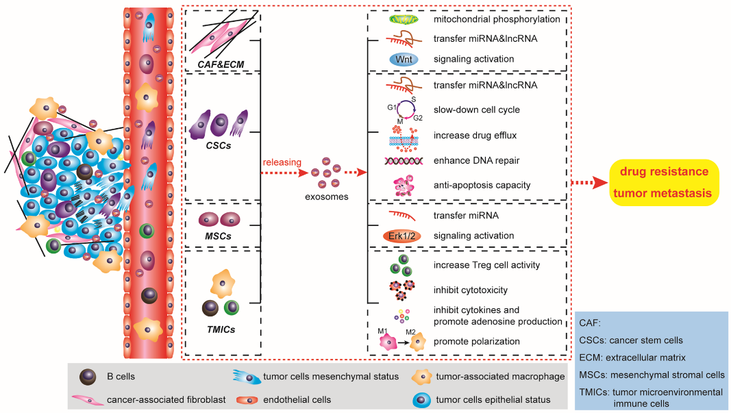 外泌体是大多数真核细胞分泌的细胞外囊泡,参与细胞间通讯。外泌体内容物包含蛋白质、DNA、mRNA、miRNA、LncRNA,circRNA等,在癌症发展过程中起着至关重要的作用:如调节肿瘤生长、耐药和侵袭转移等,并且可以用作肿瘤患者的预后指标或分级依据。该文阐述了外泌体内容物在癌症中的生物学功能, 外泌体与肿瘤微环境之间的相互作用,以及外泌体影响的肿瘤上皮-间质转化、侵袭和迁移的机制,展望了基于外泌体的肿瘤抑制策略。外泌体在临床肿瘤诊断和治疗中的应用潜力可为临床上使用外泌体提供精确的肿瘤治疗提供理论支持。