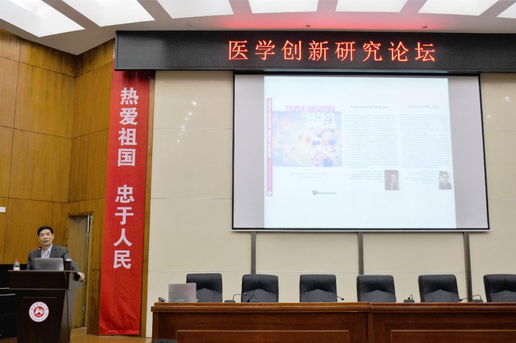 邓锡云教授通过展示两张被新冠肺炎病毒感染前后的世界地图,引出了此次论坛的主题:医学创新和肿瘤干细胞研究。他就“什么是创新”这个话题进行了阐释,并深度解读了狭义和广义上的创新的含义。通过两者的对比,他鼓励同学们树立远大的目标,积极开展科学研究创新,不断增强自身的实验和学习能力。在专业领域,邓锡云先后讲解了乳腺癌的分子分型、肿瘤干细胞以及针对三阴性乳腺癌的“老药新用”,尤其指出了洛伐他汀这种经典的降脂药物对于三阴性乳腺癌的治疗有良好的应用前景。这不仅为乳腺癌研究和临床治疗提供了很好的学术理论,而且也进一步激发了学生的医者精神。论坛的最后,邓锡云与学生交流了自己刚出版的《Triple-Negative Breast Cancer》学术专著,呼吁学生要勇于探索,不断创新,并寄托了对全体师生的美好祝愿和殷切希望。