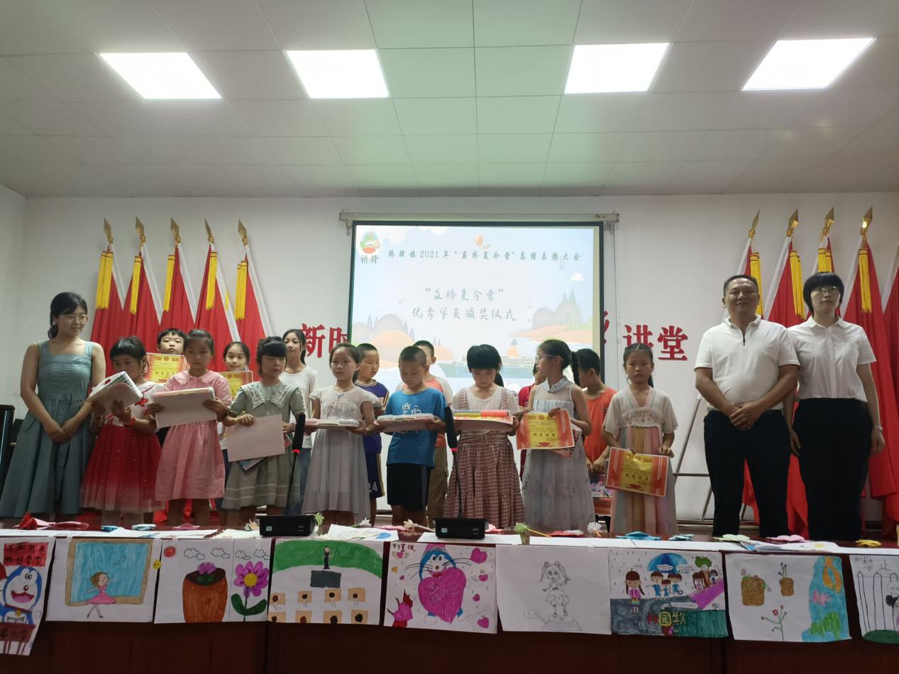 结业表彰议程中,周玮宣读优秀学员名单,周炎明、周玮、郜江洪为学员颁奖和发放学习用品。随后,毛斌、王卿向全体大学生志愿者颁发志愿服务证书,并对志愿者们这两周的辛勤付出表示感谢。最后,毛斌作总结发言。他表示,桥驿镇政府将在今后的工作中,一如既往地关心支持留守儿童事业的发展,并寄语夏令营学院要自立自强,成人成才,为建设新时代桥驿镇作出应有的贡献。
