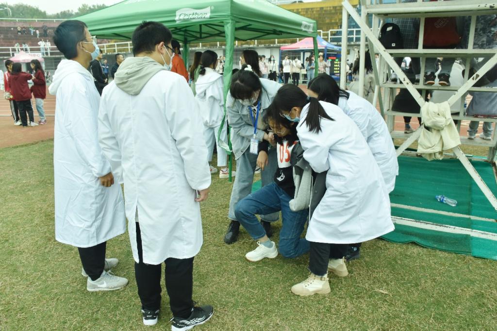 为了给有需要的运动员及时提供帮助,爱心服务队的成员与负责人提前到达医疗点做好相应的准备工作。在运动会期间,爱心服务队的成员有的为低血糖的运动员送上葡萄糖,有的为受伤的运动员处理伤口,还有的搀扶起长跑后不适的运动员前往医疗点休息。他们活跃于整个赛场,哪里有需要,哪里就有他们的身影。