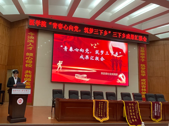 11月7日晚,我院于仁医楼学术报告厅举行了“青春心向党,筑梦三下乡”成果汇报会。本次大会由团委社会实践部举办,欧阳宇轩主持,团委书记张明明老师作开场发言,由三下乡院队队长童海、学社管三下乡队伍队长金俊豪、我院红十字三下乡队伍队长文阳冰宇、学生会三下乡队伍队长刘宇菲依次进行三下乡成果汇报。