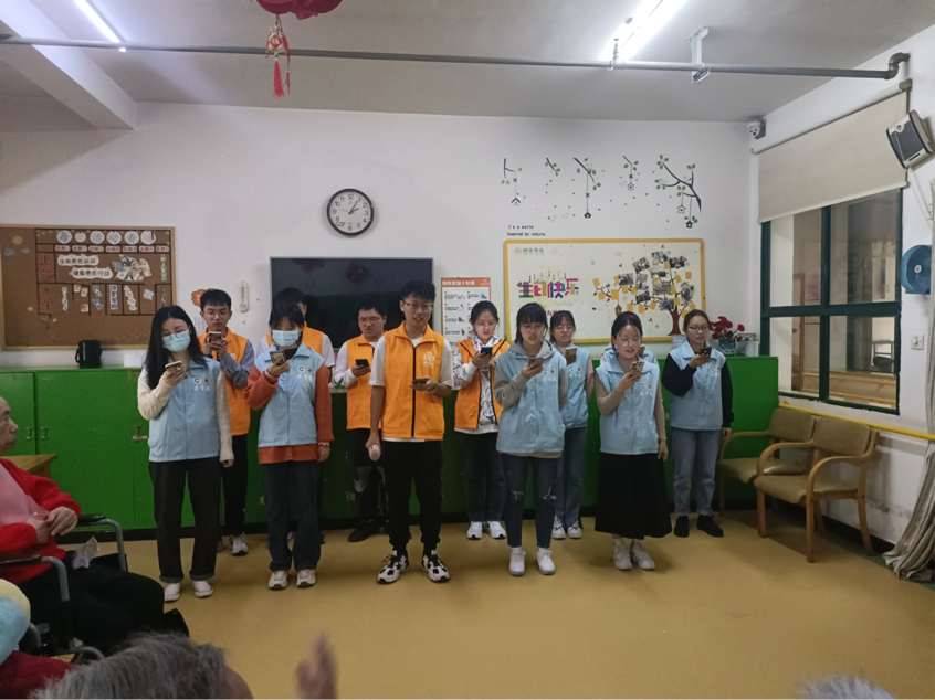 此次活动主要为行动不便但能进行一定交流的老人开展服务。为拉近与老人之间的距离,志愿者们首先向老人展示了丰富的才艺,其中有诗歌朗诵《祖国啊,我亲爱的祖国》,歌曲《我和我的祖国》以及魔术表演。熟悉且富有感情的旋律使老人们跟着音乐的节奏为志愿者打节拍。表演结束后,志愿者们陪同老人唠家常,聊最近的生活状况。在志愿活动过程中,志愿者们分工明确,细心认真,得到了老人的喜爱与工作人员的一致认可。