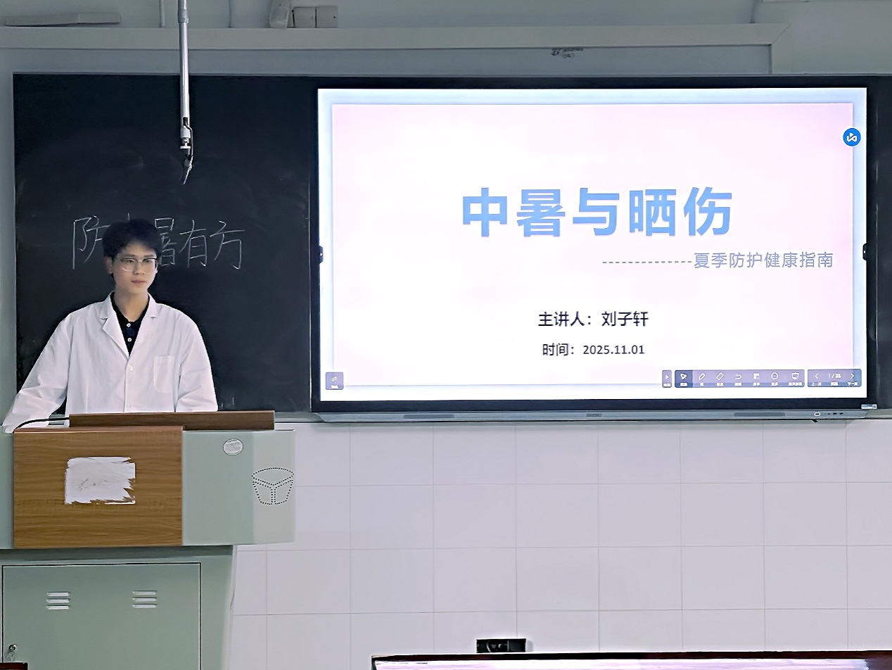 为了帮助同学们系统掌握相关知识,刘子轩从定义、应急措施与预防三方面讲解了中暑和晒伤。在中暑的章节中,他阐述了中暑的定义及其发生原因。在此基础上,刘子轩从中医与西医两个角度,详细解说了中暑的分级,以及各级对应的具体表现。同时,他介绍了中暑的预防措施、易感人群、应急方法和急救中的错误做法。随后,刘子轩以晒伤为核心内容展开叙述。为了方便同学理解,他阐述了晒伤的定义、原因与分类,并重点讲述了晒伤的应急措施以及注意事项。基于此,刘子轩从物理防护与化学防护两个角度,系统讲解了如何科学预防晒伤,并澄清了防晒的一些知识误区。