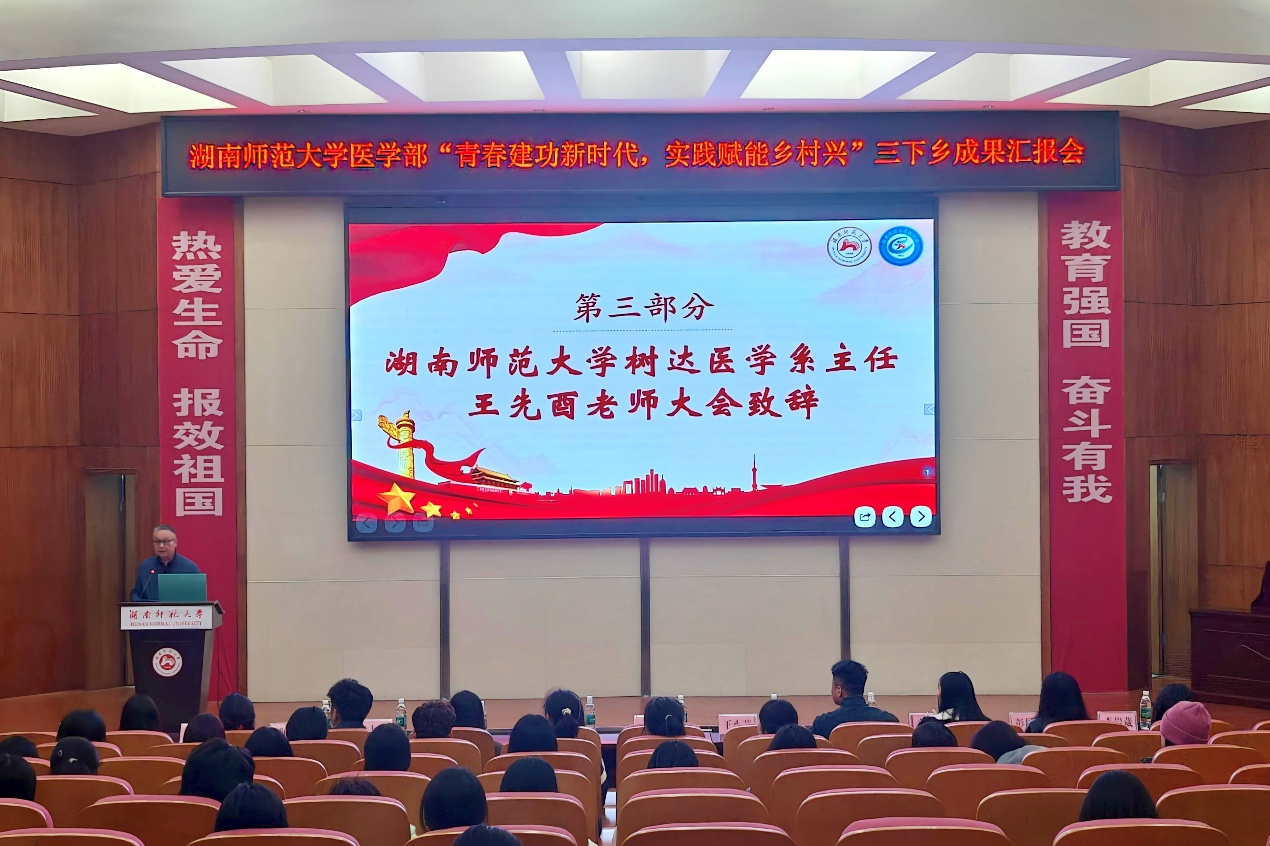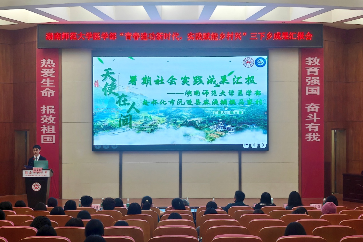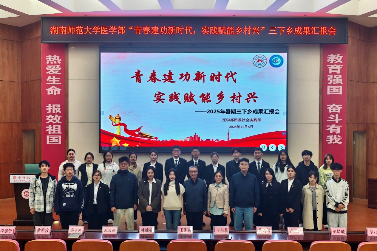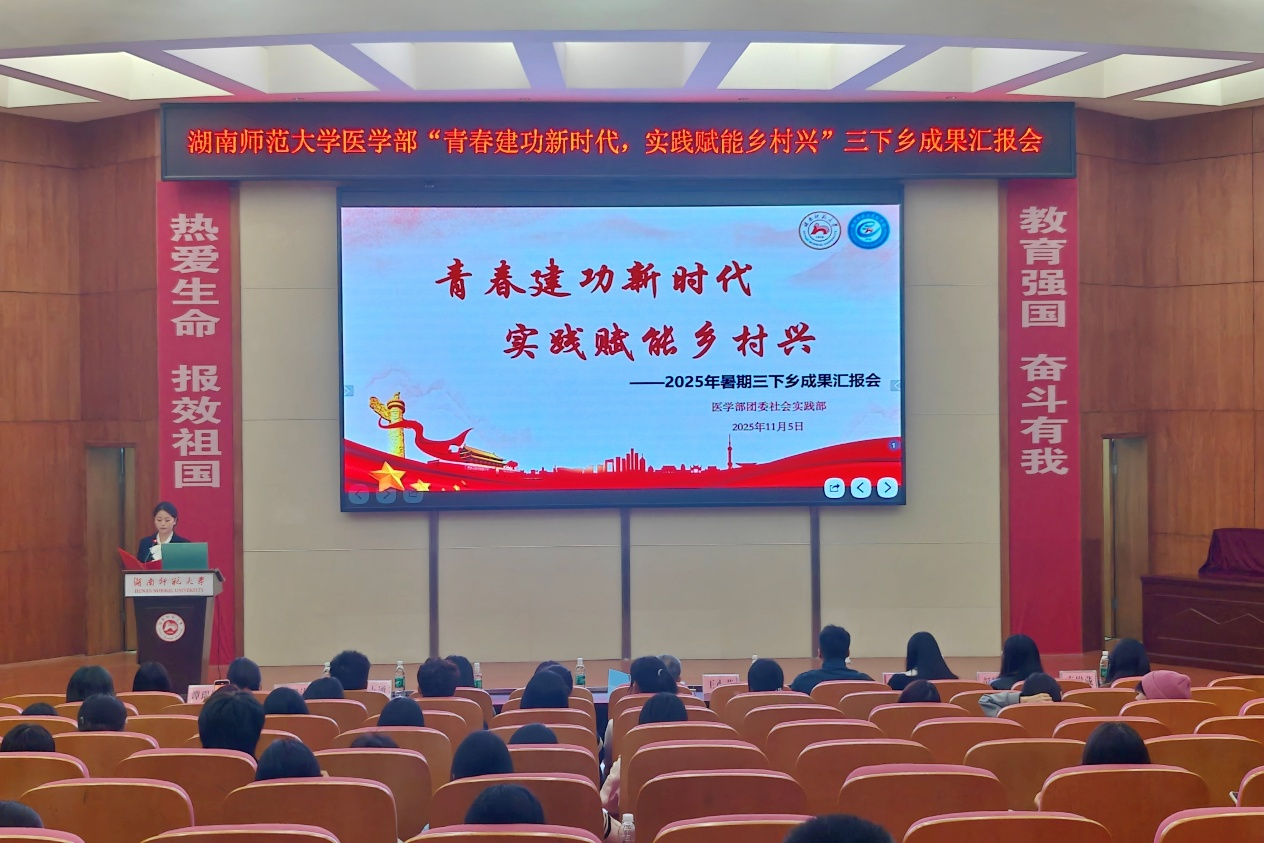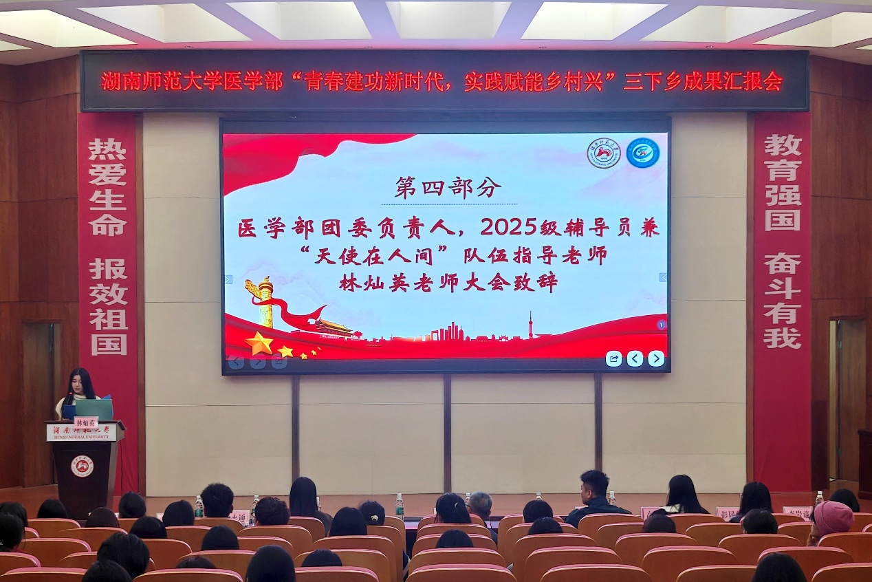 为推进2025年医学部暑期三下乡成果转化,11月5日中午,医学部于仁医楼学术报告厅开展“青春建功新时代,实践赋能乡村兴”三下乡成果汇报会。树达医学系主任王先酉、教授王小莉、医学部团委负责人林灿英、团委副书记黄鸿剑、2022级辅导员朱天爱及2025级辅导员熊永通、高严严出席。七支2025年三下乡队伍及医学部部分学生参与汇报会。大会由卢金钰主持。