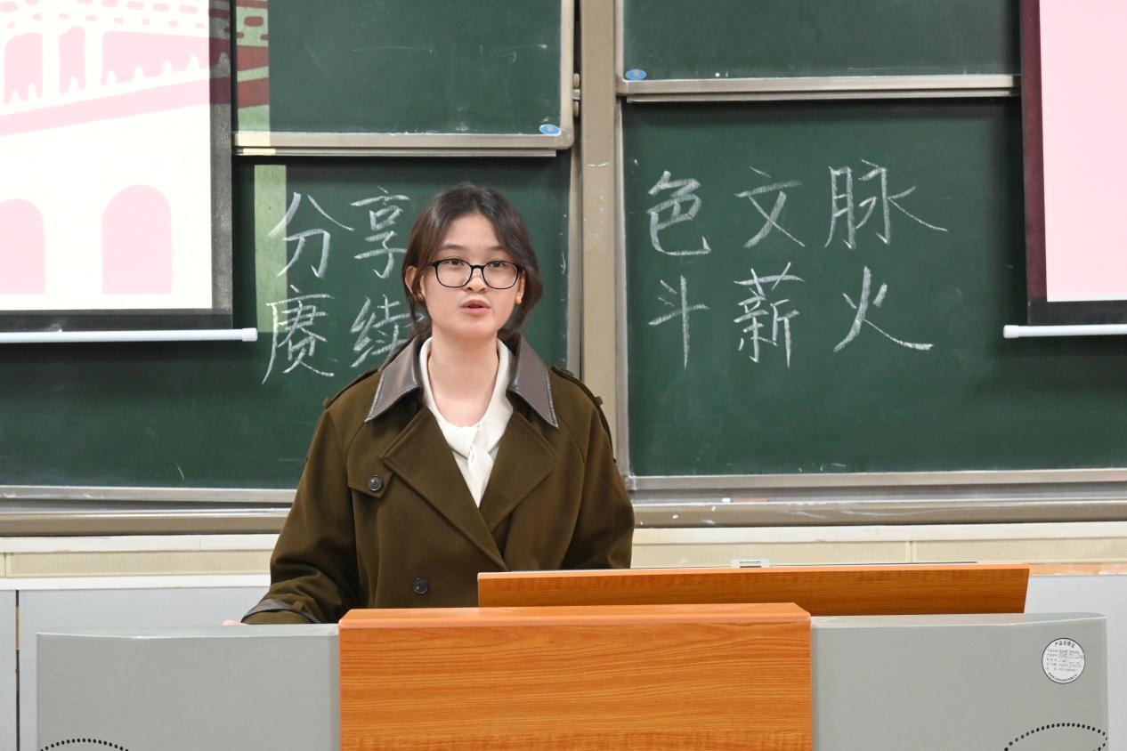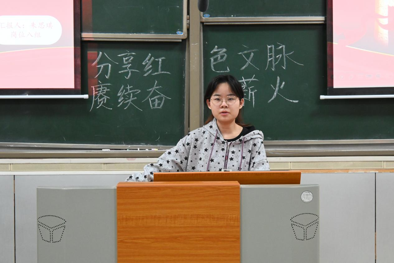 在李妍慧致辞后,六个小组的红色文脉分享汇报依次进行。岗位一组汇报人曾沛葵围绕《可爱的中国》,分析了方志敏的多元身份与著作的创作背景;岗位六组汇报人谢依米以“品读红色家书”为主题,讲述了家书故事及其时代回响;岗位八组汇报人朱思琪介绍了《白求恩传》的历史价值与白求恩精神的当代启示。随后,团委一组汇报人柳志镔阐述了“红岩精神”的内涵与传承;学生会一组一组汇报人许爽梳理了奋斗薪火的历史脉络与时代价值;青传一组汇报人卢金钰和肖怡则解析了小说《红岩》的叙事结构、人物群像及其多重价值。汇报结束后,主持人致结束词。