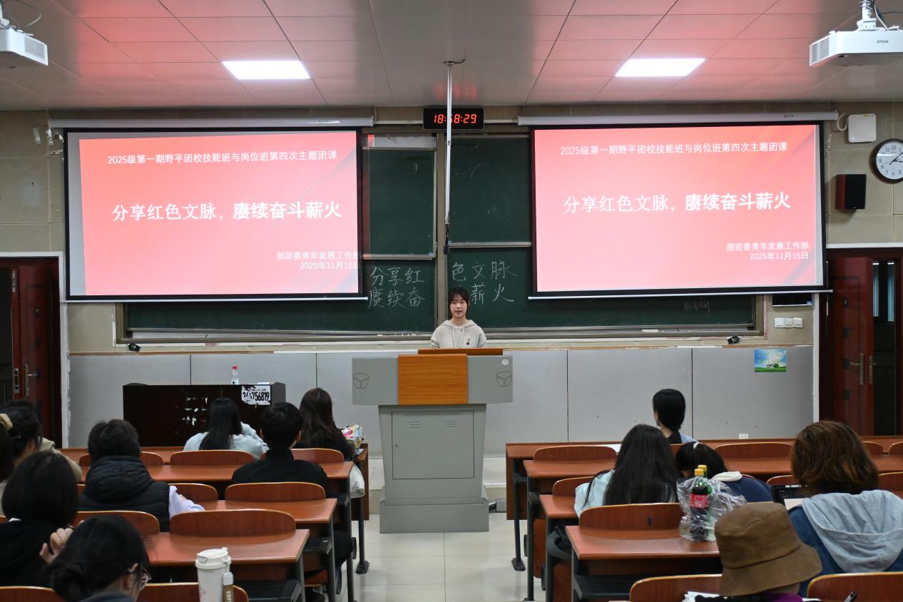 为深化团员青年的思想政治引领,引导学员从红色经典中汲取精神力量,医学部团委青年发展工作部于11月15日晚在仁医楼406教室,组织开展了2025级第一期野平团校技能班和岗位班“分享红色文脉,赓续奋斗薪火”主题团课。此次团课由青年发展工作部志愿者李妍慧担任主持,野平团校各组代表主讲,技能班与岗位班全体学生参加。