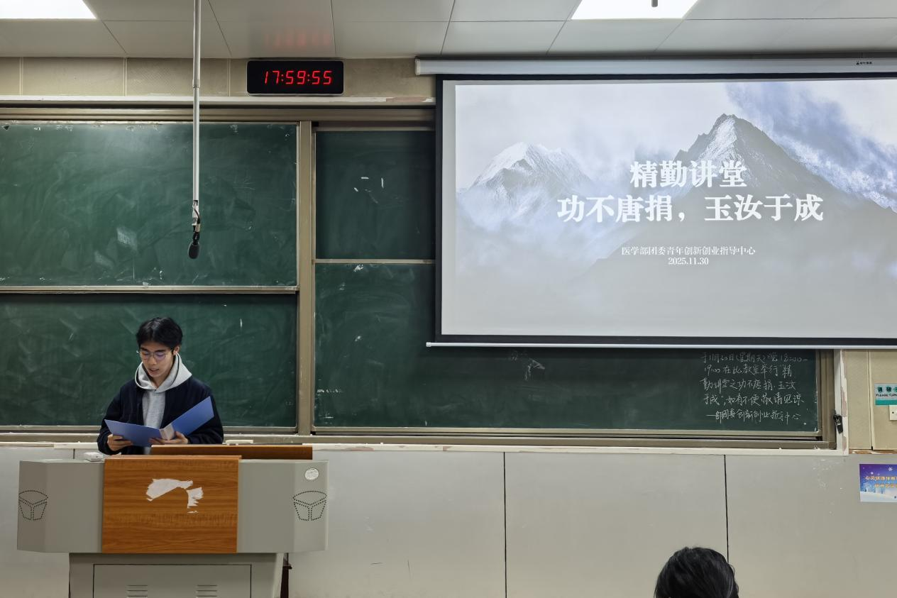 11月30日晚,医学部团委青年创业创新指导中心在仁医楼306教室举办“功不唐捐,玉汝于成”精勤讲堂。此次讲堂由2023级卓越医生班胡若扬担任主讲人,医学部部分同学参加。