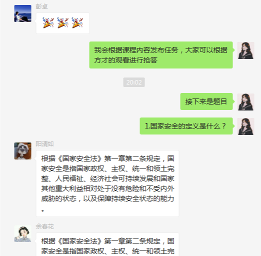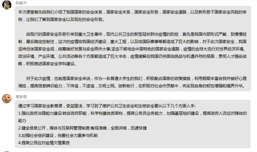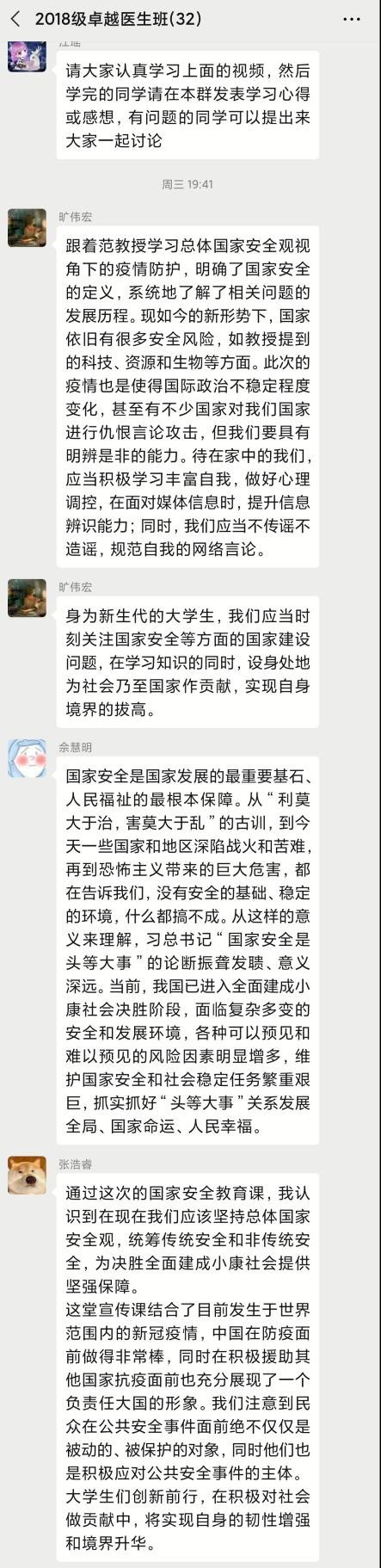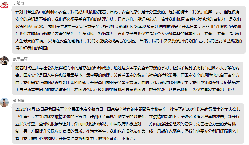 此次宣传教育活动采取线上进行的方式,各班级组织观看教育部录制的2020年全民国家安全教育日高校公共课,学习国家安全相关知识。统一观看后,各班级自主开展线上学习,通过讨论、问答等多种方式,学习公共卫生安全、生物安全等宣传教育内容。各班同学积极参与,踊跃发言,结合目前形势分享心得体会,并从医学生角度阐述如何为国家安全献出自己的一份力量。