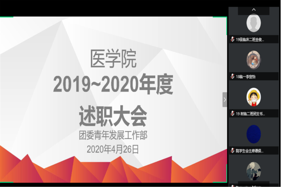 4月26日晚,我院于线上举行2019-2020年度学生干部述职大会。院团委罗宇涛老师、院团委学生副书记刘乔、院学生会主席谭俣宬、院学社联主席范宇豪、院青年传媒中心主任郭嘉仪、院团委红十字会秘书长刘浩出席此次会议,由青年发展工作部干事胡俊英担任会议主持人,各系统团学成员等学生干部参与此次述职大会。