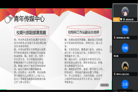 刘乔从团的自身建设、学院特色与创新工作等四个方面对院团委工作进行了报告;谭俣宬在总结学生会工作的基础上对未来工作进行展望;郭嘉仪强调了青传以宣传为主的性质,并围绕工作方法和工作中的不足展开汇报;范宇豪概括了学社联过去一年的重要工作内容并对疫情期间的工作进行简要介绍;刘浩则从活动经历和工作业绩等方面进行述职。随后,胡俊英向参会者展示了团学组织活动剪影和书面述职并进行民主评议。