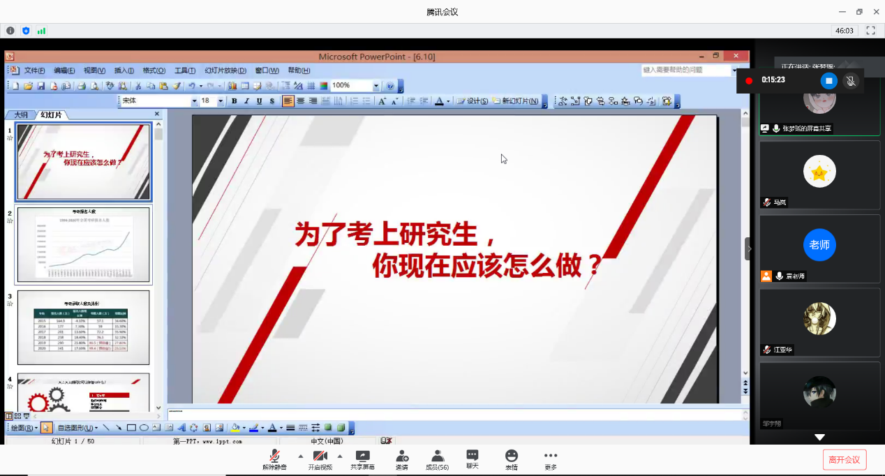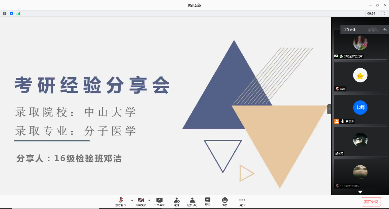6月10日晚7点30分,2019级检验班大学学习和考研经验交流会在线上顺利举行。此次交流会由班导师袁仕善组织,2020届检验班四名考研成功的学姐和2019级检验班全体学生参加。