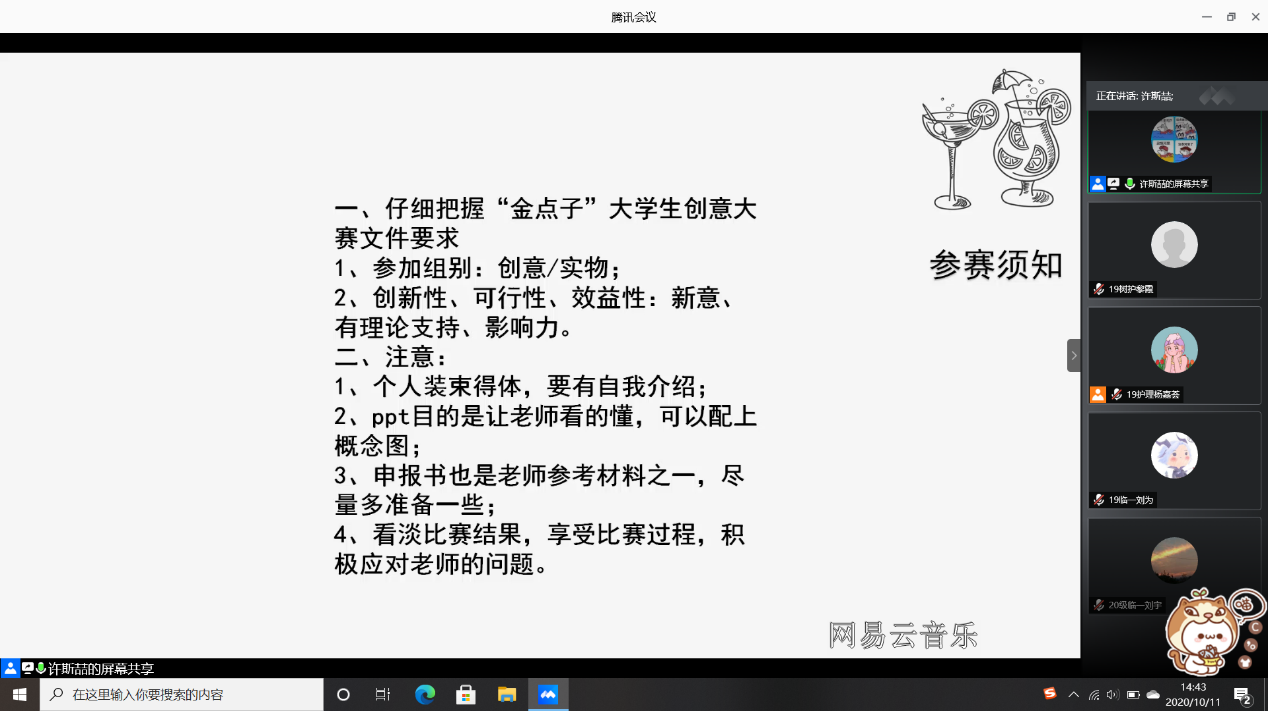 10月11日下午,我院团委青年创新创业工作部于线上举行第十届〝金点子〞大学生创意大赛宣讲会。此次宣讲会邀请了sunbet申搏第九届金点子大赛院赛参赛选手许斯喆作为宣讲人,我院19、20级部分学生参加此次活动。