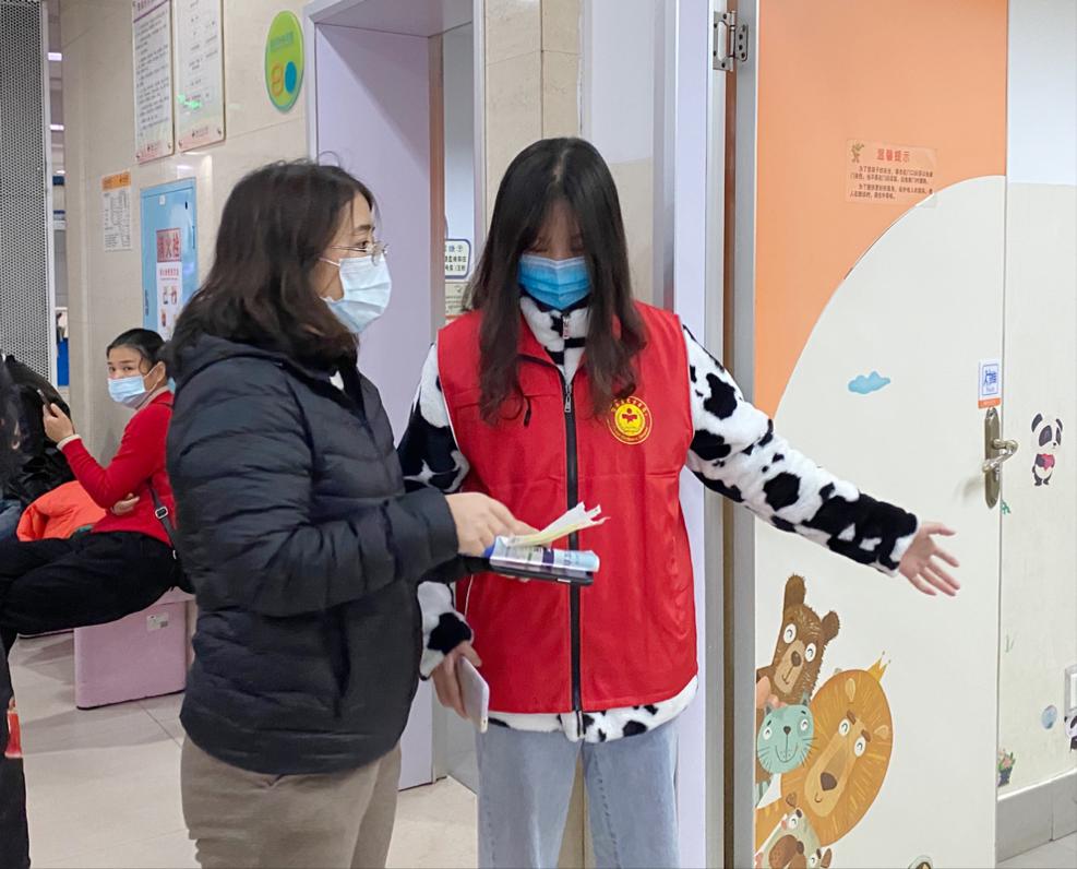 全体志愿者到达目的地后,登记姓名、领取志愿者衣服。了解自己的工作后,志愿者们到达指定的位置。当家长们迷路时,志愿者为其指路。部分家长不清楚在何处就诊,志愿者会带领他们到相应的科室。志愿者还在家长对缴费单存在疑惑时进行解释并指导家长们操作自助机。活动过程中,志愿者和小朋友们进行了互动。有时候家长无暇照料小孩,志愿者还负责看管好小朋友,保障小朋友的安全。志愿者的身影出现在许多角落。活动结束后,志愿者们进行合影留念。