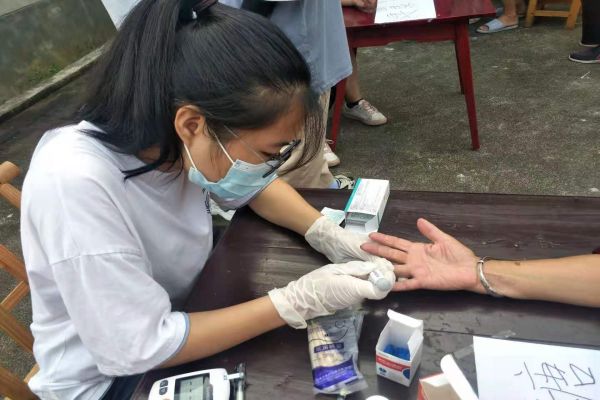队员们于早上七点半到达相关地点开始了准备工作,等待村民们的到来。在测量血糖前,队员们主动询问村民是否有糖尿病史、是否为空腹状态、是否已就食超过两小时,以此来保证检测结果的准确性。对于其中一些血糖偏高的村民,宣讲组队员们会耐心细致地为他们提出一些在饮食、生活和作息方面的建议。