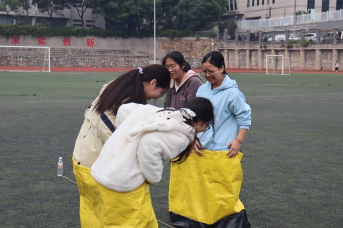 “集体袋鼠跳接力赛”同学们四个人分为两两一组,两个人在“大麻袋”中合力向前跳跃,到达终点换成剩余两人重复游戏过程,在游戏中,同学们体验这种“两人一足”的同时,更体会到了齐心协力的重要性,想要又快又稳,必须要求我们顾及同行者。