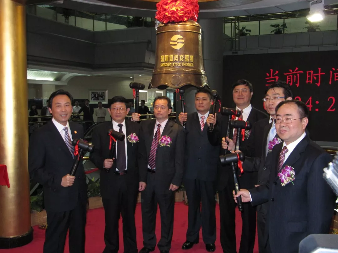 2010汉森制药刘令安董事长(左排起第三位)在深圳证券交易所敲锣上市