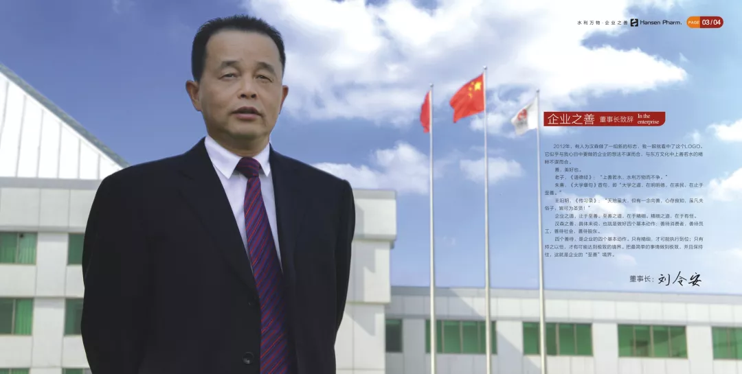 这种情怀和担当体现在他对诚信经营的坚守上。“汉森历来有两个不拖欠,一是不拖欠员工薪酬待遇,二是不拖欠供应商的货款”,刘令安一句承诺,数十年如一日严以恪守,已然成为了汉森在业内、在社会上的优良口碑。对每一笔销售合同,只要是有利于客户的条款,他从不违背,且最大限度地满足客户的需求;而客户因特殊原因无法履行合同的某些条款时,他会根据对方的具体情况酌情处理,甚至宁愿给对方定个信用度,让其在一定的赊欠范围内。诚信是双方的,当他面临困境时,业务伙伴们同样回报了信任。2006年下半年,为了扩大产品销售市场,汉森在全国各省加大了广告投放力度,因此,原材料采购资金及时支付出现了一定的困难。以山东沧州四星公司、深圳九星公司、浙江新德公司、重庆正川公司为代表的供货商纷纷对汉森制药伸出温暖之手,同意汉森延期付款,并继续签订了来年的合作协议。数十年的诚信经营,刘令安锻造了汉森制药一条坚固的产业链,上下游的业务伙伴同舟共济,不离不弃,成为了制药行业一股不可忽视的力量。