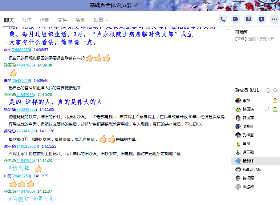 在线党日会议时,孙国瑛首先介绍了卢永根同志的生平及主要优秀事迹,播放了时代楷模卢永根同志先进事迹纪录片。大家学习了卢永根的主要事迹后,非常感动,纷纷发表感言。基础系党支部支委申丽认为,把自己的理想和祖国的需要紧密联系在一起,就是爱国的最好体现。支委简晓红同志说,卢永根捐款880万,捐赠2商铺,捐献自己的遗体,成无言良师,这里充满榜样的力量!杨剑锋老师提到布衣院士卢永根院士,在我国改革开放40年,经济建设取得辉煌成就的今天,仍然这么简朴的生活,却将毕生积蓄捐献教育事业,不忘初心,是真正的共产党员。贺丽萍、谭三勤、李翔等同志纷纷表示,向卢院士学习,搞好本职工作,与祖国同呼吸共命运。