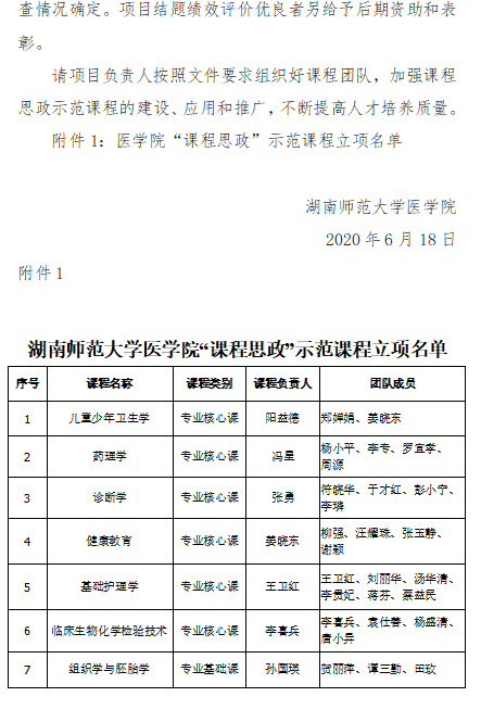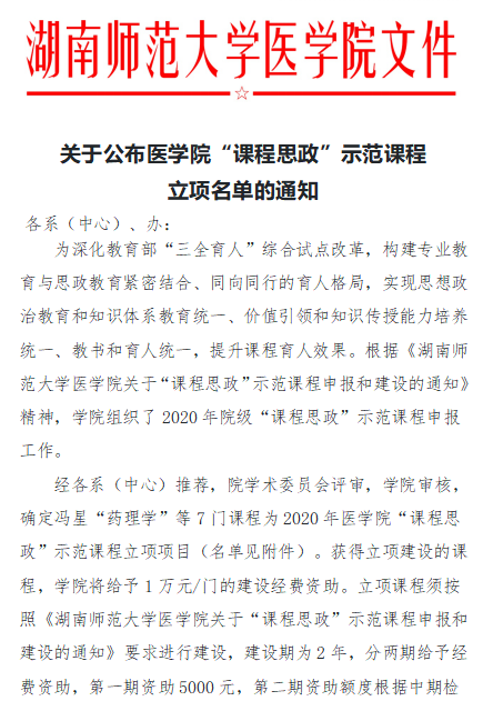 经各系(中心)推荐,院学术委员会评审,学院审核,确定冯星“药理学”等7门课程立项为2020年医学院“课程思政”示范课程,要求项目负责人按照文件要求组织好课程团队,加强课程思政示范课程的建设、应用和推广,不断提高人才培养质量。我院对获得立项建设的课程,给予1万元/门的建设经费资助,并明确对项目结题绩效评价优良者另给予后期资助和表彰。