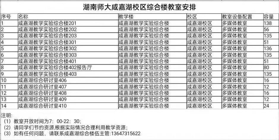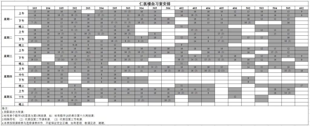 每栋楼正门墙面均贴有自习时间表,清楚的标记了在每天每时可用于自习的教室,方便同学们查阅。