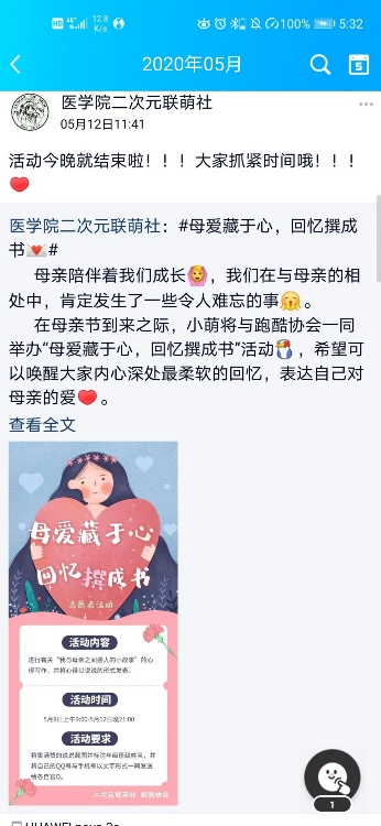 母爱是幼时啼哭时温暖怀抱,是年少轻狂时的苦口婆心,是走向远方时的不舍泪水。母亲节来临前夕,为宣扬“百善孝为先”的传统美德,激起感恩母亲的思绪,我院学生社团管理服务中心跑酷协会与二次元联萌社于5月8日—12日联合举办“母爱藏于心,回忆撰成书”主题活动。