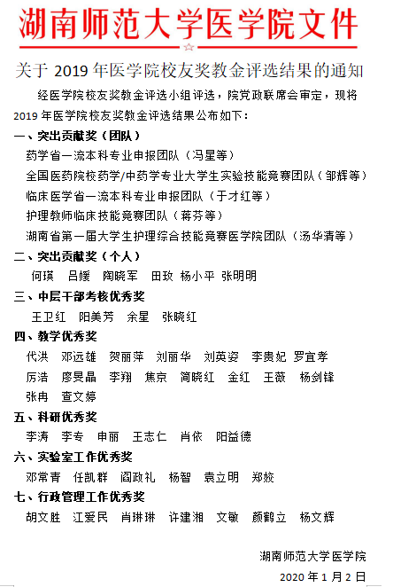 2020年1月5日下午,为迎接新春,展望2020年美好前景,表彰2019年优秀教职工,凝聚人心,团结奋进,我院举办了新年联欢会暨年终总结表彰大会。sunbet申搏原常务副校长、临床系教授卢岳华,sunbet申搏原副校长、医学分会会长瞿树林,湖南省工商联副主席、湖南省医药行业协会会长、湖南省第十一、十二、十三届人大代表,汉森集团董事长、医学分会顾问刘令安,长沙生殖医学医院院长、长沙宁儿妇产医院院长、医学分会荣誉会长刘习明,岳麓区政协常务副主席、医学分会副会长曾高杰,湖南普瑞康医药有限公司董事长、医学分会长沙校友会副会长李光焰,长沙美亚医疗科技有限公司总经理、医学分会理事曾令辉,原外国语学院党委书记、树达学院医学系系主任王先酉,原美术学院党委书记、医学分会副会长谭伟等出席会议。