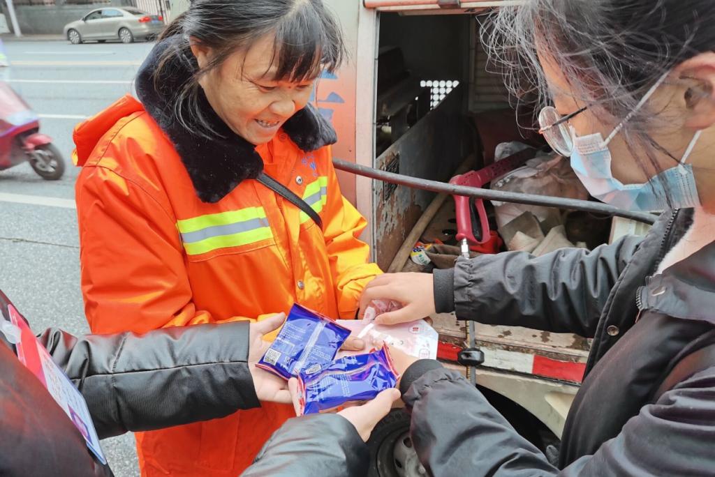 正在处理垃圾的环卫工人收到志愿者们的意外惊喜后,脸上洋溢着灿烂的笑容,她说:“真的很感谢你们,在这么冷的天气还来给我们送东西。”